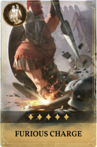 Deals might damage to up to 3 enemy troops in fan-shaped area (damage rate: 400.00%, might bonus) and increases hero's might, armor, and strategy by 48.00 (might bonus) for 6s.