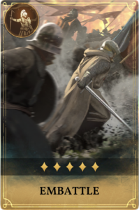 3★: Every 6s: ~120% recovery (strategy+might bonus), -~10% troop damage taken 3s. 10% Damage Immunity 1s. Commander next skill +25%. [★1: recovery +20%] [★3: adds commander next skill +25%] [★5: immunity +5% → 15%, commander next skill → 50%]. 0★: ~100% recovery, ~10% reduction, 10% immunity, no commander buff.