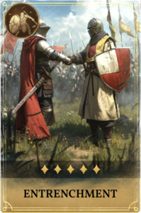 5★: Reduces 2 nearby allied troops' damage taken by ~15% (armor bonus) + strategy damage taken by ~18% (armor bonus) for 6s. 100 initial rage.
